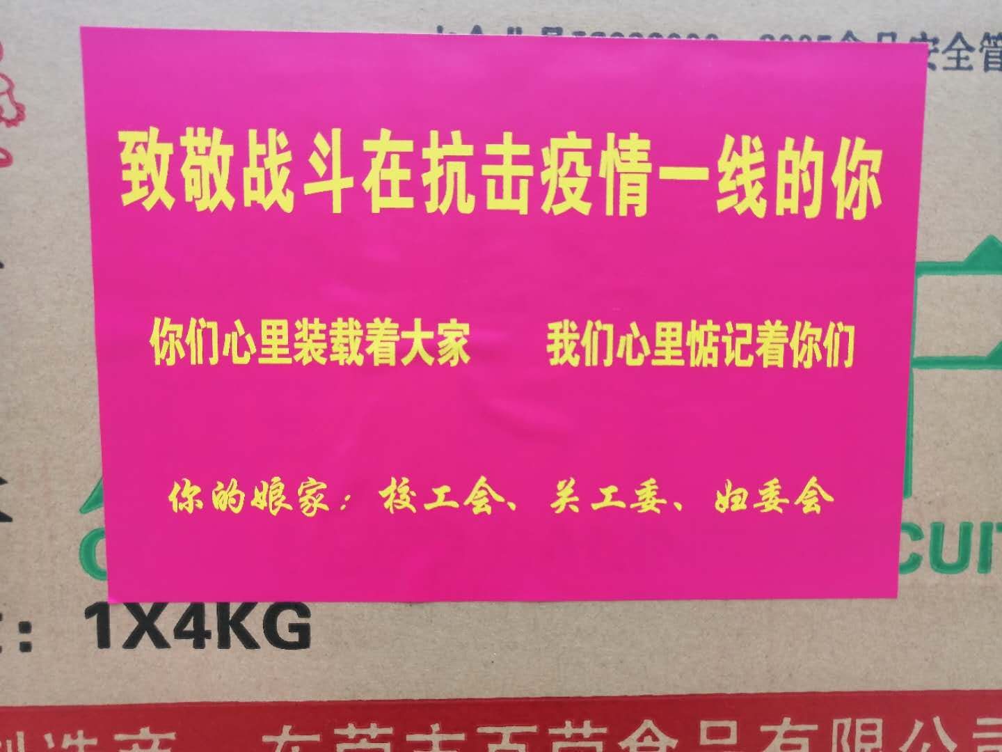 2月24日,校工会、关工委、妇委会联合向学校战斗在抗击疫情一线的安保、宿管、物业管理人员送上慰问品,对他们坚守工作岗位,守护校园和师生安全表示衷心感谢。