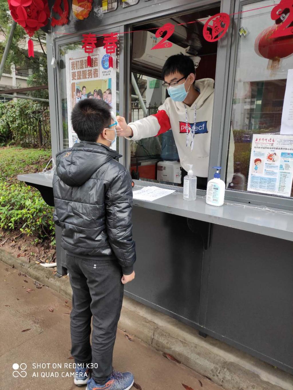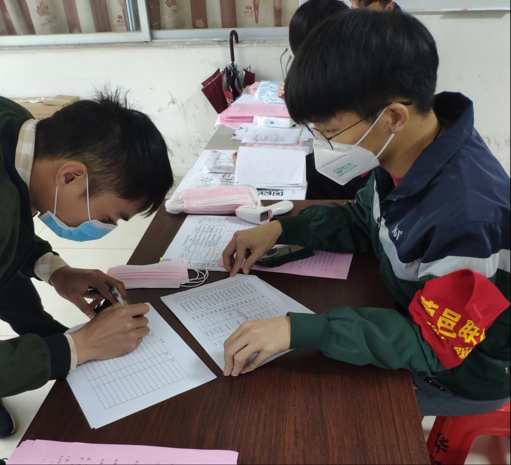 与此同时,校内的志愿者们也没有松懈,以麦宇诗同学为代表的志愿者们,从1月至今坚守在校内,投身于我校社区管理防疫工作中,积极协助我校社区服务管理员做好体温测量、登记出入记录、为隔离同学送餐等志愿服务工作,为我校的疫情防治工作尽一份力。