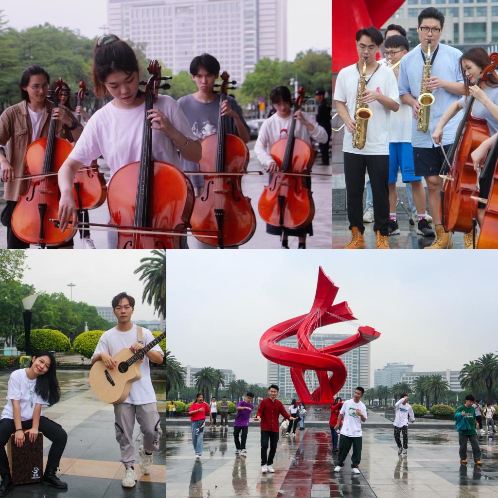 4月28日正式录制,我校学子作为大学生青年代表参与其中。近百名优秀学生代表在东莞市地标前,表演街舞、吉他、手风琴、打击乐、管乐,充分展现了东莞当代青年青春活力、积极向上的健康形象。该摄影作品将于5月4日在央视新闻展播。