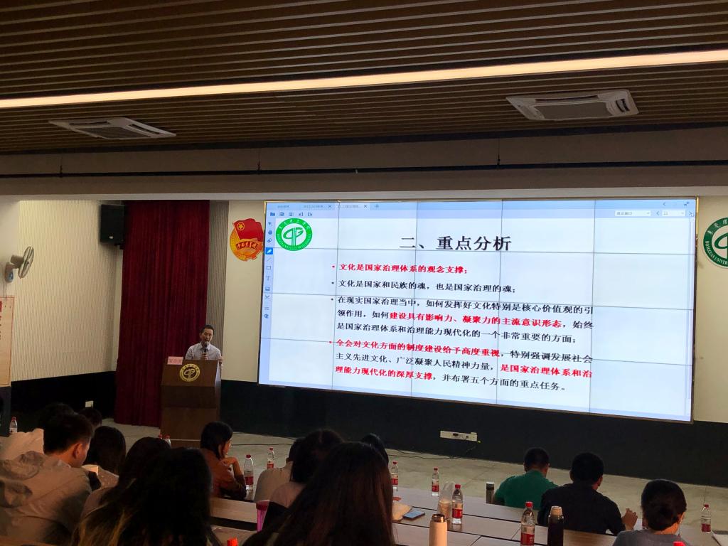 本次学思讲堂还邀请了马克思主义学院党委副书记郭奕鹏博士进行授课,为全体学工人员做《坚定信仰,创造卓越:学习党的十九届四中全会和校第三次党代会精神》报告。