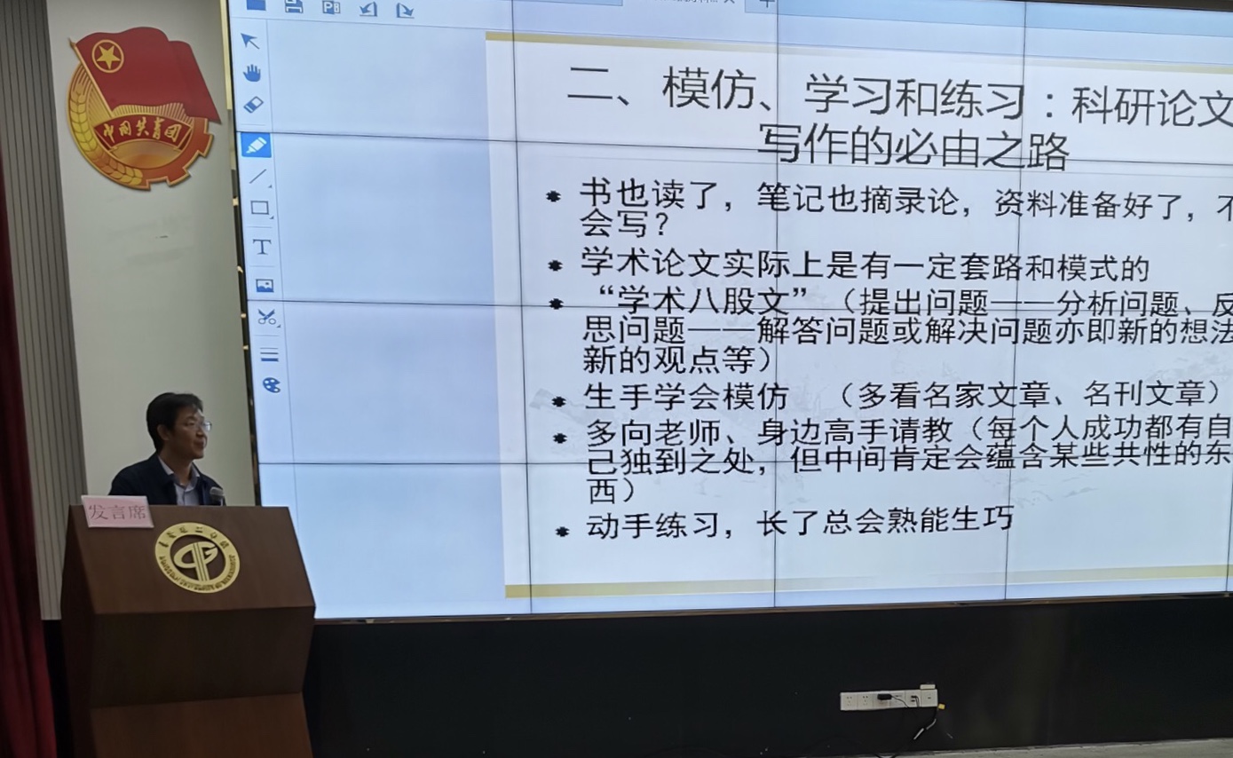 关锋教授以撰写论文和申报课题为核心,以“如何搞好科研”为主题进行讲解。他表示,文科科研的起点是阅读,模仿、学习和练习则是科研论文写作的必由之路,当形成知识储备、自己的能力、领域和风格,就是科研成熟的标志。并分享了学术论文选题、论文完善和投稿、课题申报等技巧。关锋教授的讲座详细实用,获得了各位老师的热烈欢迎。