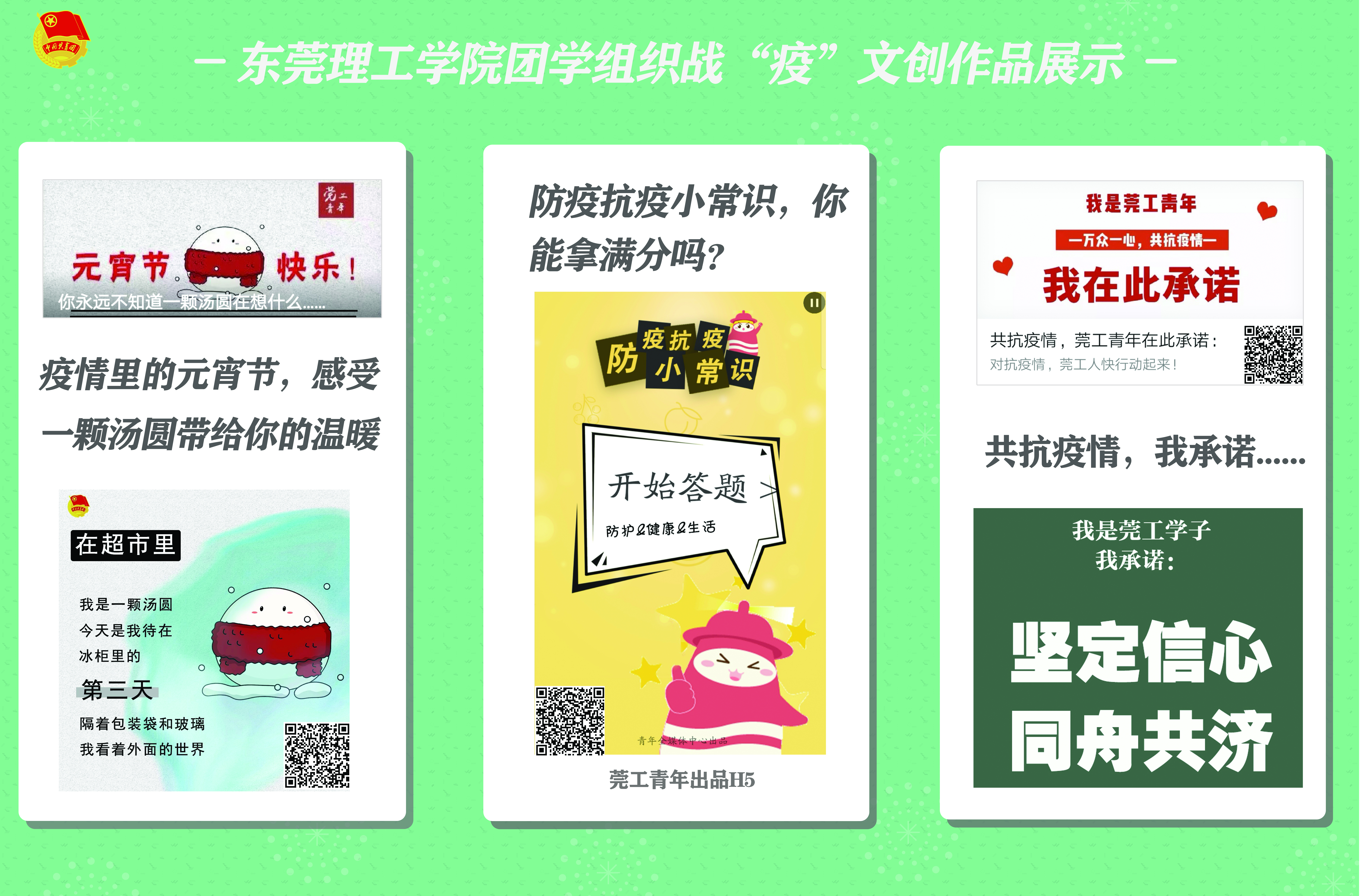 疫情发生以来,校团委积极动员我校团员青年参与疫情防控宣传工作,各级团学组织结合自身特色、优势,在莞工青年、莞工学生会、莞工志愿服务中心等校级组织及二级团学组织官方公众号全方位宣传抗击疫情工作,主动发布防疫期间注意事项、官方政策以及抗击疫情的感人故事,向同学们发出倡议,至今制作文创作品102件,包含推送、平面设计作品、视频、音频、h5等,累计阅读量超过7万次,在校内外广大团员青年中形成较大影响力,为防控疫情做出一定贡献。