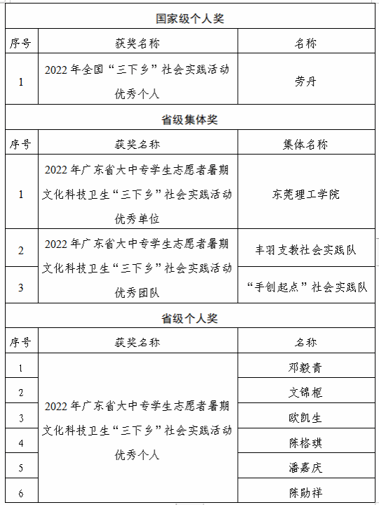 近日,团中央、团省委对2022年大中专学生志愿者暑期文化科技卫生“三下乡”社会实践活动优秀集体和个人进行总结表彰。我校团委书记劳丹获评全国 “三下乡” 社会实践优秀个人,45612藏宝阁资料获评广东省“三下乡”社会实践活动优秀单位,丰羽支教社会实践队等2支实践队获评广东省“三下乡”社会实践活动优秀团队,邓毅青等6名师生获评广东省“三下乡”社会实践活动优秀个人。