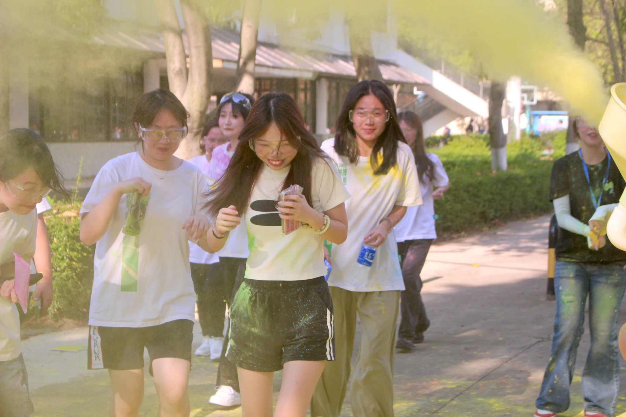 穿越喷射在空中洒下的彩色面粉,在背景板摁上各种颜色的手掌印……整个赛道被五彩斑斓的色彩所覆盖,仿佛一条绚丽的彩带,引领着同学们向前奔跑。他们在色彩的海洋中穿梭,与身边的伙伴们一同欢笑、一同欢呼,用汗水和热情书写着属于青春的精彩篇章。
