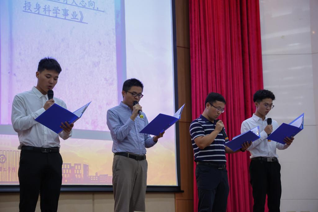 莞工的莘莘学子刻苦学习,志于追求卓越。化能学院优秀班主任代表何运兵博士、刘鉴博士以及今年获得国家奖学金的学生代表李世德和罗彬辉共同诵读了科学经典文章《朱道本:青年人应有大志向,投身科学事业(节选)》。他们分享了学习和参赛的经验,朗诵了我国著名的有机化学、物理化学家,中国科学院院士朱道本的文章,表达了老一辈科学家对青年的期望,展现出一份青年人应有的爱国主义精神与责任担当。