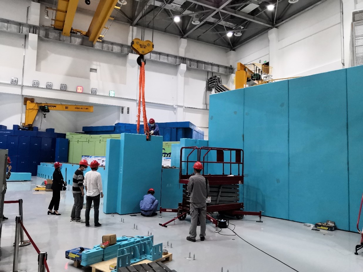 新冠肺炎疫情发生以来,在做好疫情防控的前提下,2月3日多物理谱仪团队采取现场、网络等多种方式如期复工进行谱仪的设计及施工准备工作,将疫情对工程建设造成的影响程度降到最低。最终,多物理谱仪所需的总体积约400立方米的混凝土预制块于3月10日开始陆续运抵中国散裂中子源实验大厅,在3月25日前多物理谱仪屏蔽体所需全部材料如期到达现场。3月25日开始,工作人员进行谱仪的现场位置标定及下钉工作,并在4月3日开始了多物理谱仪的屏蔽体安装工作。