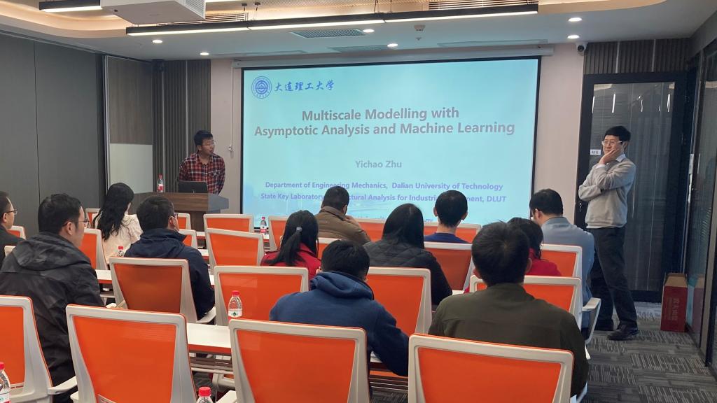 朱一超教授以《渐近分析与机器学习耦合之跨尺度建模方法研究》为题,深入介绍了传统渐近分析方法与新兴机器学习工具结合的新研究方法,并分享了在跨尺度系统开展建模与仿真领域取得的重要创新成果。报告以多尺度点阵渐变填充结构的优化设计为出发点,利用渐近均匀化分析显式推导描述点阵渐变构型局部等效刚度矩阵的系列单胞偏微分方程,利用神经网络避免反复求解单胞问题,同时考虑该方法与计算机辅助几何平台(CAD)的对接,以推动“结构分析-优化一体化功能”的实现。最后,报告讨论了渐近分析-机器学习耦合方法在其它跨尺度物理系统场景的应用,包括发展材料辐照损伤长时模拟、位错连续动力学模型的推导,并从量子力学视角刻画材料表界面效应等。