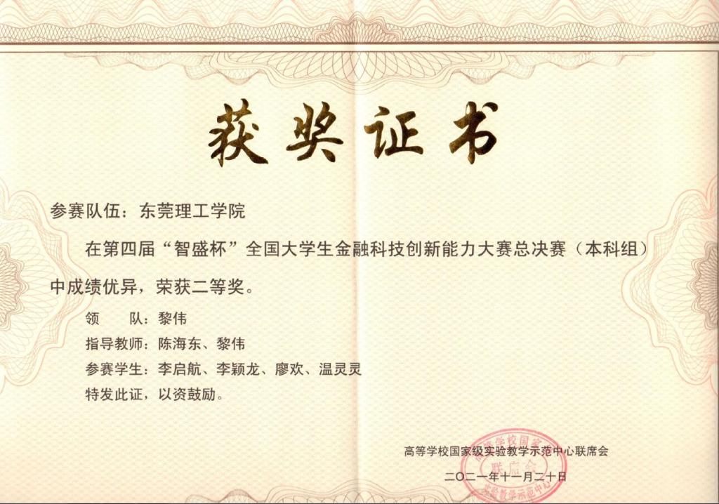 第四届“智盛杯”全国大学生金融科技创新能力大赛全国总决赛颁奖仪式于12月15日在线上举行。本届大赛由高等学校国家级实验教学示范中心联席会经济与管理学科组主办,暨南大学承办,金融科技产学协同创新联盟、广州互联网金融协会协办,深圳智盛信息技术股份有限公司提供技术支持。大赛紧扣新文科建设要求,依托金融科技产业背景下区块链技术、人工智能技术、大数据技术等与金融深度结合的行业业态,重点考察金融科技创新的理论与实践。