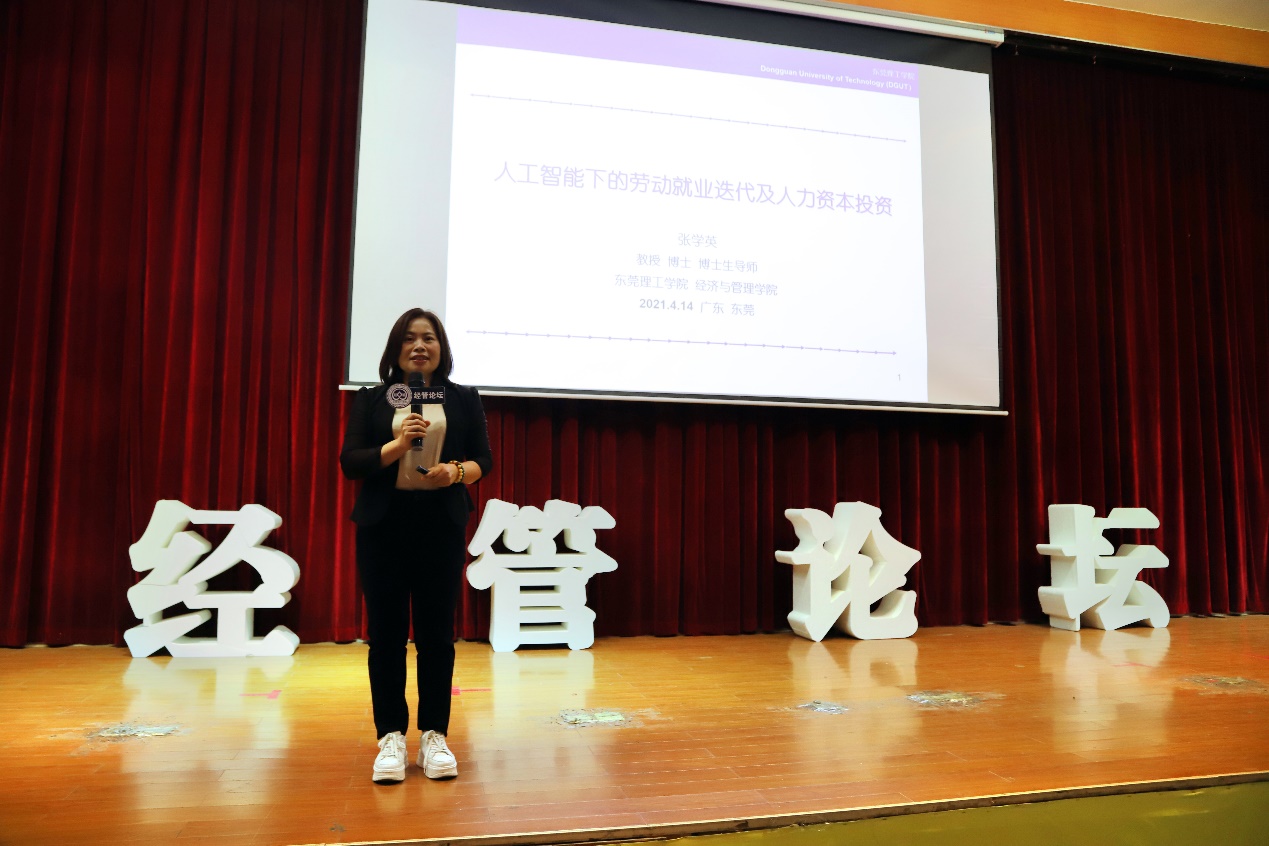 4月14日晚,经管学院于莞城校区学术报告厅举办经管论坛第三十九期之“AI时代下劳动就业迭代及人力资本投资”专题讲座,经管学院特聘教授张学英担任主讲。