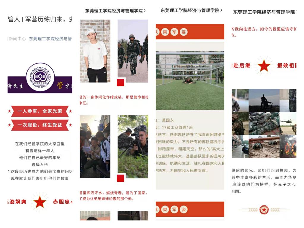 为全方位做好征兵宣传工作,学院微信公众号推出“出彩经管人之退伍尖兵”系列推送,采用学生喜闻乐见的方式,站在学生的角度分享参军感悟,以身边榜样影响身边同学,为学院征兵工作营造良好氛围。