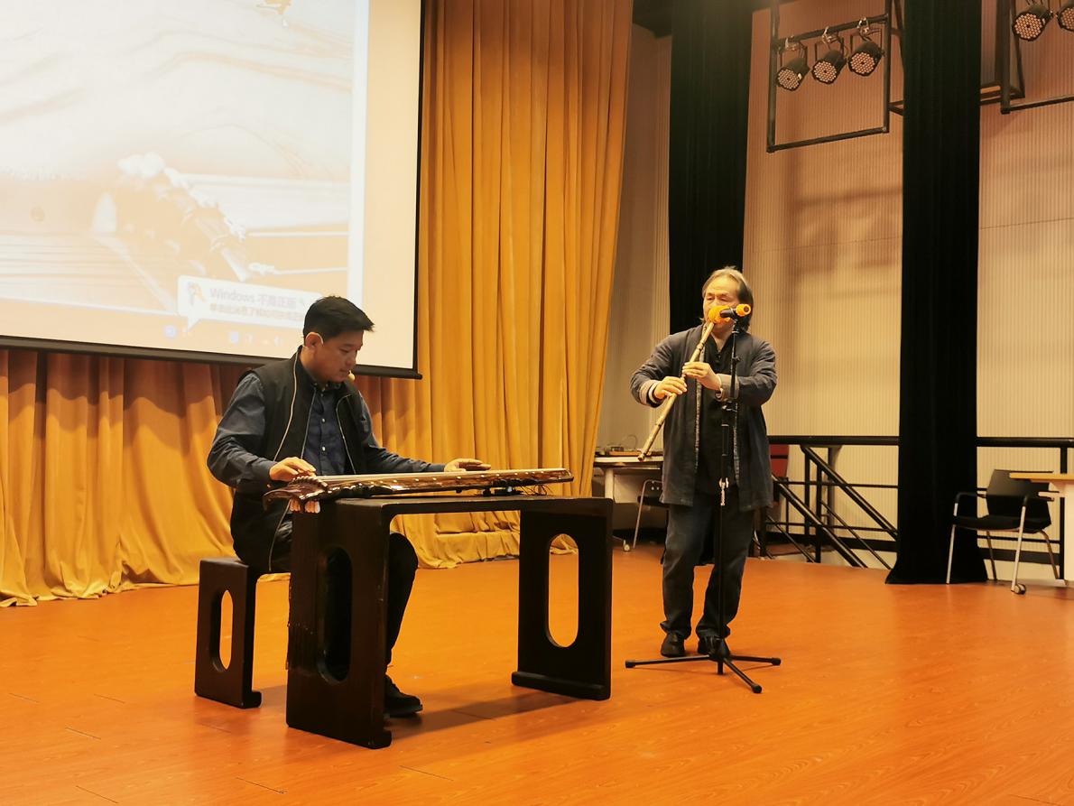 刘汉超老师以《多彩的管乐世界》为主题,讲解了中国古代民族管乐乐器的种类和风格特点。他向学生们介绍了民族管乐中不同材质的器乐品种,如骨、土制的骨笛、骨哨、埙、陶笛;竹制的竹笛、箫、尺八、排箫、笙、葫芦丝·巴乌;以及木制的唢呐、管子等。他在现场展示各类乐器实物,向学生们详细讲解了各种民族管乐的风格特点和演奏技巧。他一边讲解一边示范演奏,吹奏的十孔埙,瞬间将人带入一种远古、苍凉的时空,时而幽深、时而哀婉,绵绵不绝;洞箫乐音淳厚、柔和、幽静,呜咽婉转,如泣如诉。此外,与箫形状相似的“尺八”,以管长一尺八寸而得名,其音色苍凉辽阔,又能表现空灵、恬静的意境。