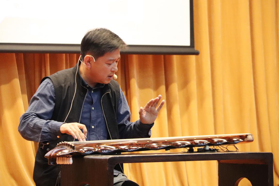 王可逊老师讲解了古琴艺术的历史渊源、发展脉络和艺术特色。古琴是中华民族最古老的华夏本土弹弦乐器,是中华传统文化的瑰宝,以其历史久远,文献瀚浩、内涵丰富和影响深远为世人所珍视。有着3000年悠久历史的古琴音乐,是中国音乐的重要组成部分,是中国传统音乐文化的代表。王可逊老师在讲解过程中,还亲身示范演奏了古典名曲《流水》,并演绎弹唱现代曲琴歌《将进酒》。古琴中的古风雅韵让学生们大开眼界,感叹中国传统音乐的神奇魔力,仿若让人进入独具东方山水意境、如诗如画的琴音世界。