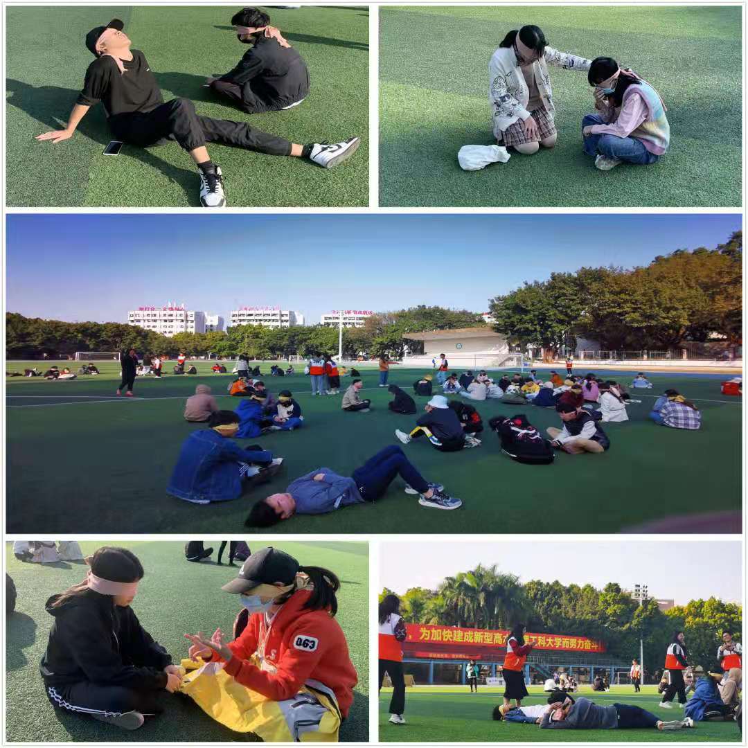 活动分为五个环节:蒙眼匹配、互相交流、围圈识人、交流分享、交换书签。在交流过程中,同学们蒙上眼睛,放下手中手机,心无杂念,呈现自己最舒服最自在的状态,其中有同学轻躺在操场上,用心交流,细心倾听,主动关怀。简短愉悦的聊天后,工作人员打乱聊天组合,让同学们在人群中寻找伙伴,围圈识人充满着各种惊喜。接着分享环节中,沟通需要艺术同时也需要切入点,有聊关于彼此的家乡,童年的回忆等话题。最后同学们在书签上写上对小伙伴的祝福并送予对方。