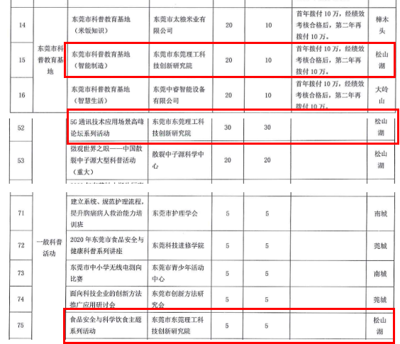8月17日,东莞市科学技术协会发布了《关于下达2020年度东莞市科普和学会科技服务项目资助计划的通知》。科技创新研究院共申报项目3项,3项项目全部入选资助计划,获批资助经费总额55万元。其中我单位获批为东莞市科普教育基地(智能制造),资助金额20万元;“5G通讯技术应用场景高峰论坛系列活动”获批重大科普活动项目,资助金额30万元;“食品安全与科学饮食主题系列活动”获批一般科普活动项目,资助金额5万元。