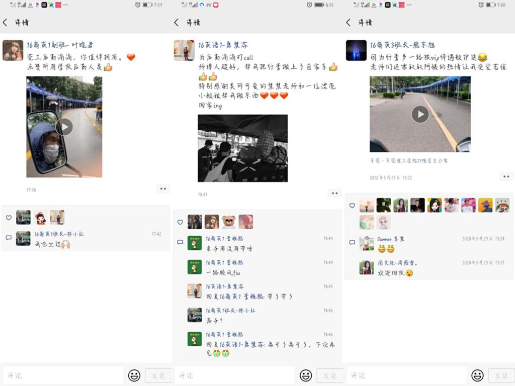 在毕业学生朋友圈中也不断涌现了他们对后勤工作者的感谢和肯定,发出“后勤滴滴,值得你拥有”、“为后勤滴滴打call”的感慨,表示后勤滴滴确实解决了同学们搬运行李的难题。在社区门口,“有事找后勤滴滴”成了他们毕业期间的共通语。