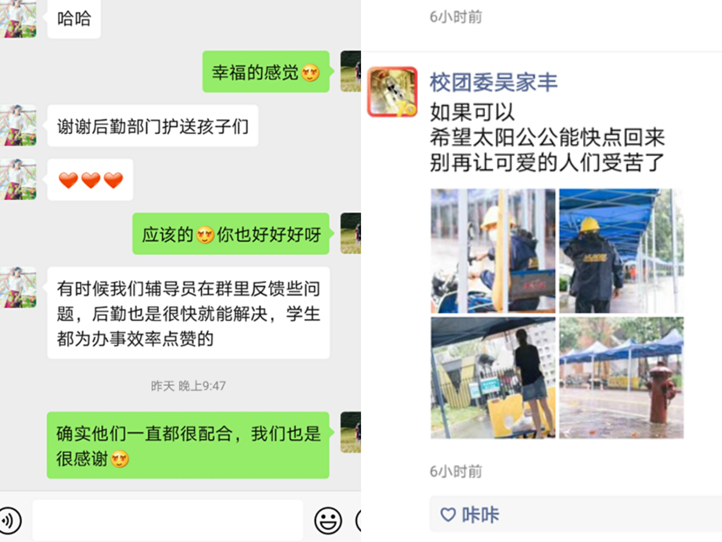 网络空间安全学院2016级软件2班訾同学说,四年来,印象中他们一直很细心,很周到,表现特别好,我们也从来没有听说因后勤人失职造成麻烦这些不愉快的事,感觉就是润物细无声的一种状态,而且他们平日里也会尽可能帮助我们。今天返校,因疫情封锁,搬行李很不便利,特别是女生行李很多,力气也不大,后勤滴滴车真的很便利。