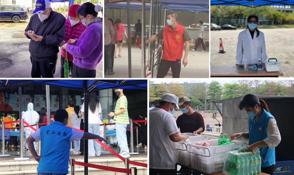后勤党员身影无处不在,驻守校内外核酸检测现场,积极参加核酸检测志愿服务,提醒大家保持一米间隔距离、协助长者打开核酸检测小程序、做好卫生医疗工作、协调饮用水和工作餐的安排。