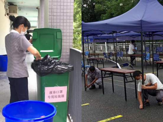 13日、14日学生考试当天,后勤管理办统筹协调,抽调了40名工作人员协助供餐服务和维持现场秩序;卫生所医务人员在三个进校通道、三个食堂、考场、校医室的待转运区、临时医学分诊区值守,及时应对学生突发医疗情况;清洁工来回走动消杀公共接触点和场地;水电工做好现场维护工作;食堂共接待就餐4千余人次。