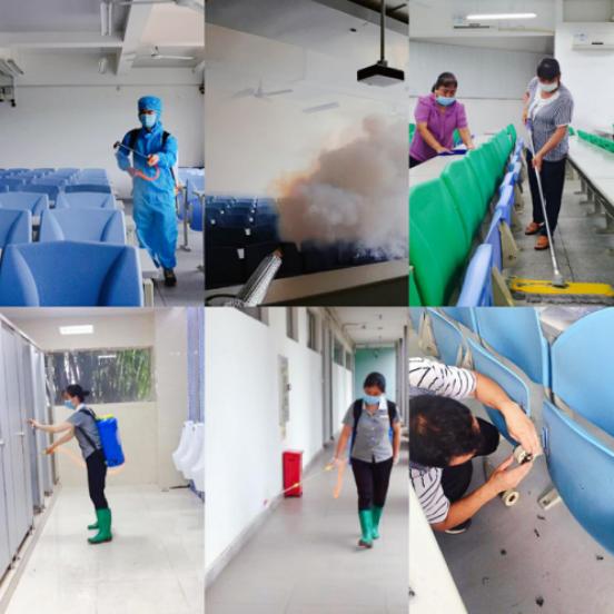 该考试处于疫情防控期间,考生多、要求高、任务重,后勤管理办提前部署,6月1日起便开展相关服务保障工作,共完成了107间专升本教室的电路、课桌椅检修,空调清洗消毒,课室环境专业消毒、卫生保洁工作;召开专门会议部署研究供餐工作,制定预案,做到责任到人。