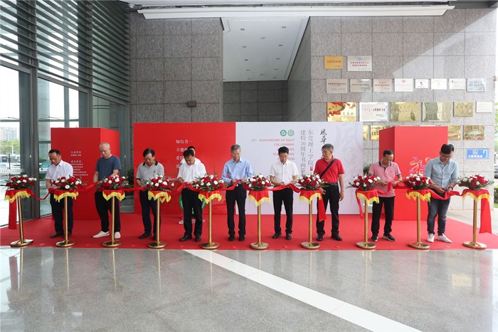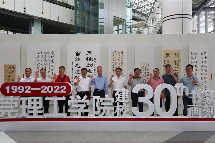 校领导成洪波、马宏伟,嘉宾黎桂康、张群炎、钟淦泉、周汉标、黄贵田,校友代表谭凯帆、梁健雄一起为建校30周年书画篆刻展剪彩,预祝活动圆满成功。