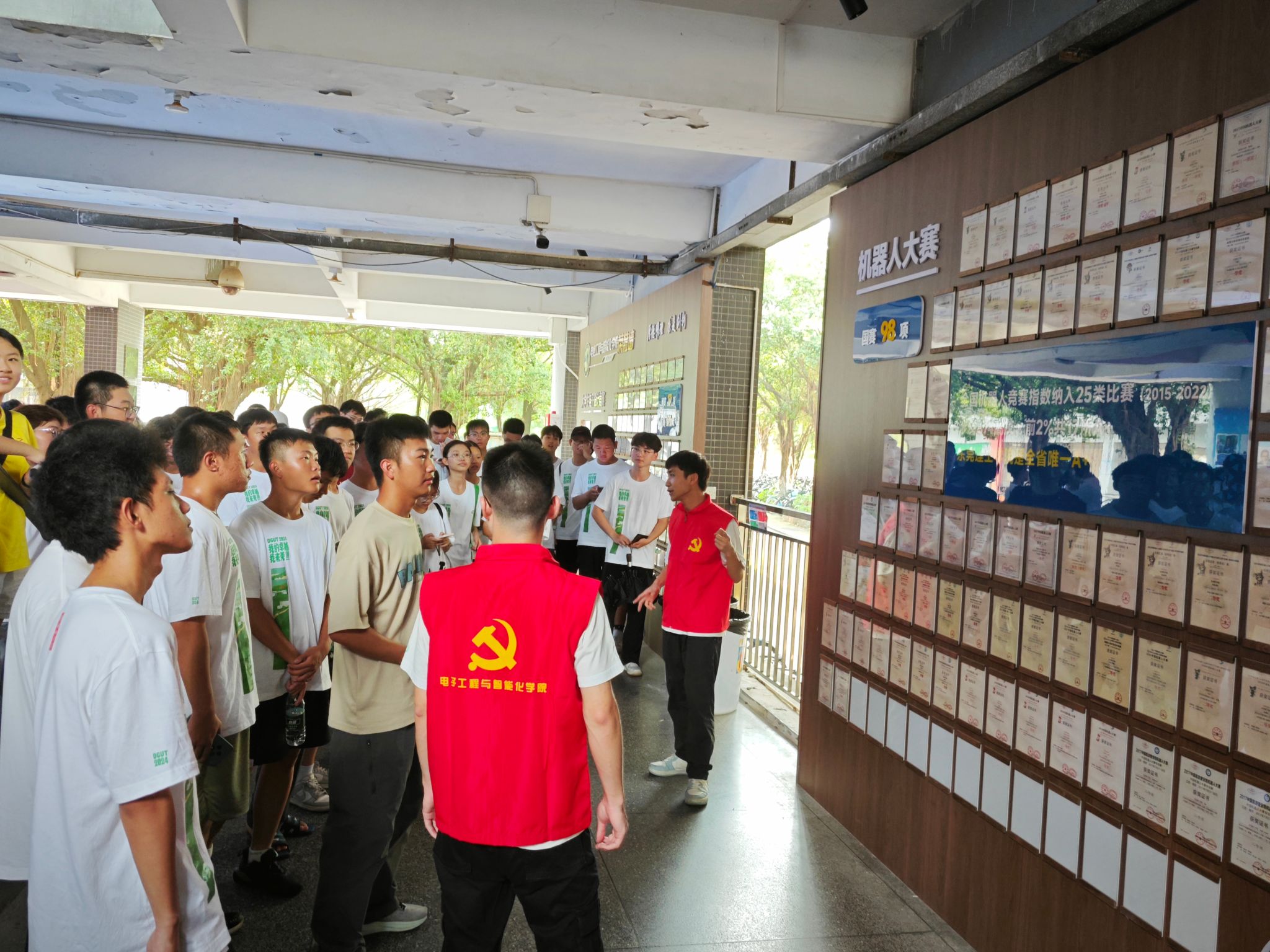 本次活动旨在通过分批、分期组织大一新生进行校园探索和实践,增强学生的爱国荣校意识,提升其综合素养,并促进学生之间的交流与合作。活动起点设置在知行广场,在为同学们介绍完毕知行广场以及学生社区活动场域后,志愿者带领同学们“穿越”宿舍区,来到学生活动中心了解窗口办事业务。随后,途经孔子像、文科楼,来到电子楼。值得一提的是,来自电智学院高年级的学生党员积极报名参与了本次讲解服务,他们分别就“理工科常见竞赛项目的类别、难易程度”“不同年级学生参赛经验”“实践活动与队伍组建”“各年级优秀学生事迹”等专题进行了现场分享,为同学们提供了宝贵的第一手经验,激发了他们对学术竞赛和实践活动的兴趣和热情。
