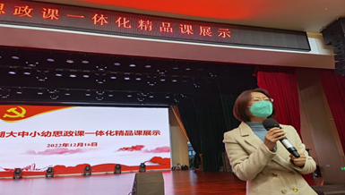 在汇展演示环节,松山湖中心幼儿园园长陈果、中心小学校长刘庆兵、北区学校德法课教师胡红敏、松山湖中学副校长杨碧玉及我校大学生宣讲团成员陈莹相继走上讲台与大家分享了各自的公开课。从《太空行走》到《重走长征路》,从《中国发展的机遇与挑战》《北斗凌空,星耀苍穹》到《东莞城市传奇》,一堂堂高度契合各自学龄段的精彩课程令人目不暇给、美不胜收。