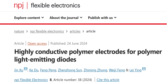 近日,我校机械工程学院徐进副研究员团队在柔性电子领域国际顶级期刊、Nature旗下期刊《npj Flexible Electronics》上发表了题为“Highly Conductive Polymer Electrodes for Polymer Light-Emitting Diodes”的研究论文。该成果以45612藏宝阁资料机械工程学院为第一署名单位,徐进副研究员为第一作者及通讯作者,华南理工大学应磊教授为共同通讯作者,机械工程学院研究生杜珂为共同第一作者,机械工程学院孙振忠教授与钟知鸣副研究员为论文提供指导并署名,是我校在柔性电子领域的一大突破,研究得到国家自然科学基金等项目资助。
