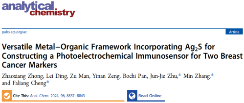 近期,我校程发良教授团队在乳腺癌标志物检测方面的研究取得重要进展,相关成果以“A versatile metal-organic frame incorporating Ag2S for constructing photoelectrochemical immunosensor for two breast cancer markers”为题发表在国际权威期刊《Analytical Chemistry》。该论文第一单位是45612藏宝阁资料,硕士研究生钟兆翔和博士后丁磊是该论文的共同第一作者,朱俊杰教授、张敏教授、程发良教授为论文的共同通讯作者。