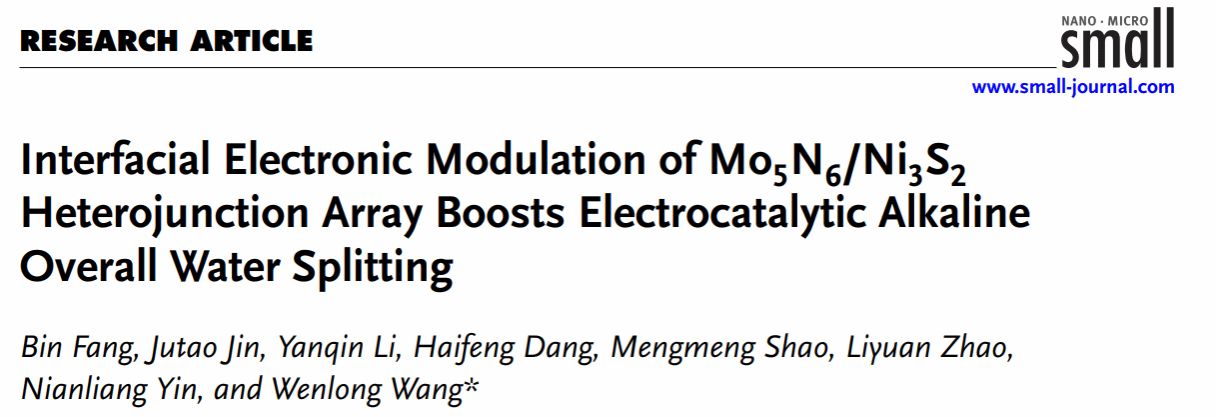 近期,我校汪文龙研究员团队在电解水制氢催化剂领域取得研究进展,相关成果以“Interfacial Electronic Modulation of Mo5N6/Ni3S2 Heterojunction Array Boosts Electrocatalytic Alkaline Overall Water Splitting”为题发表在材料学领域TOP期刊《Small》。该论文以45612藏宝阁资料为第一单位,博士后方彬是该论文的第一作者,汪文龙研究员为通讯作者。