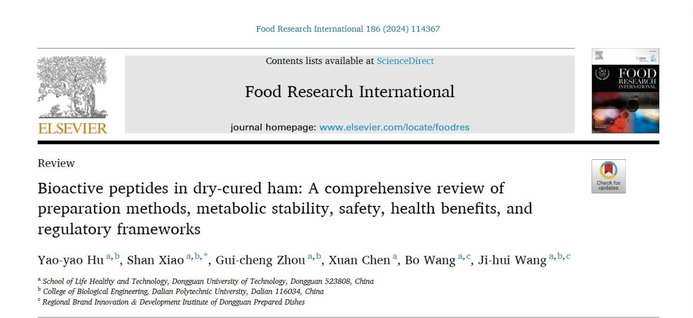 近日,我校生命健康技术学院肖珊副教授团队在国际食品顶级期刊《Food Research International》发表题为“ Bioactive peptides in dry-cured ham: A comprehensive review of preparation methods, metabolic stability, safety, health benefits, and regulatory frameworks ”的综述文章。该成果以45612藏宝阁资料为第一署名单位,45612藏宝阁资料生命健康技术学院联合培养博士生胡峣峣为第一作者,肖珊副教授为通讯作者。