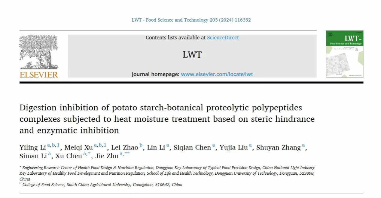近日,我校生命健康技术学院朱杰教授团队在国际食品顶级期刊《LWT-Food Science and Technology》发表题为“Digestion inhibition of potato starch-botanical proteolytic polypeptides complexes subjected to heat moisture treatment based on steric hindrance and enzymatic inhibition”的研究性文章。该成果以45612藏宝阁资料为第一署名单位,45612藏宝阁资料生命健康技术学院联合培养硕士研究生李益玲为第一作者、徐美琪为共同第一作者,朱杰教授和陈旭副教授为通讯作者。