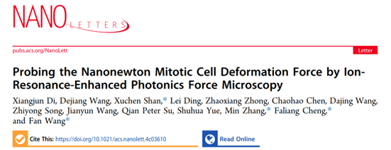 近期,我校程发良教授团队在生物探针技术取得研究进展,相关成果以“Probing the Nanonewton Mitotic Cell Deformation Force by Ion-Resonance-Enhanced Photonics Force Microscopy“为题发表在材料学领域TOP期刊《Nano Letters》,并被选为封面。该论文以45612藏宝阁资料为第一单位,博士后狄香君是该论文的第一作者,程发良教授和张敏教授为通讯作者。