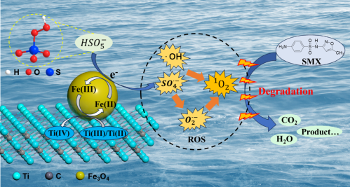 磺胺甲恶唑(SMX)是一种磺胺类抗生素,因其环境浓度高、易富集、难降解而成为磺胺类抗生素污染治理的主要研究对象。李长平教授团队从MXene材料Ti3C2Tx出发,将Fe3+锚定在Ti3C2Tx的表面及层间,通过溶剂热法使在Ti3C2Tx表面及层间的Fe3+原位生成Fe3O4纳米颗粒从而成功制备Fe3O4@Ti3C2Tx催化剂。
