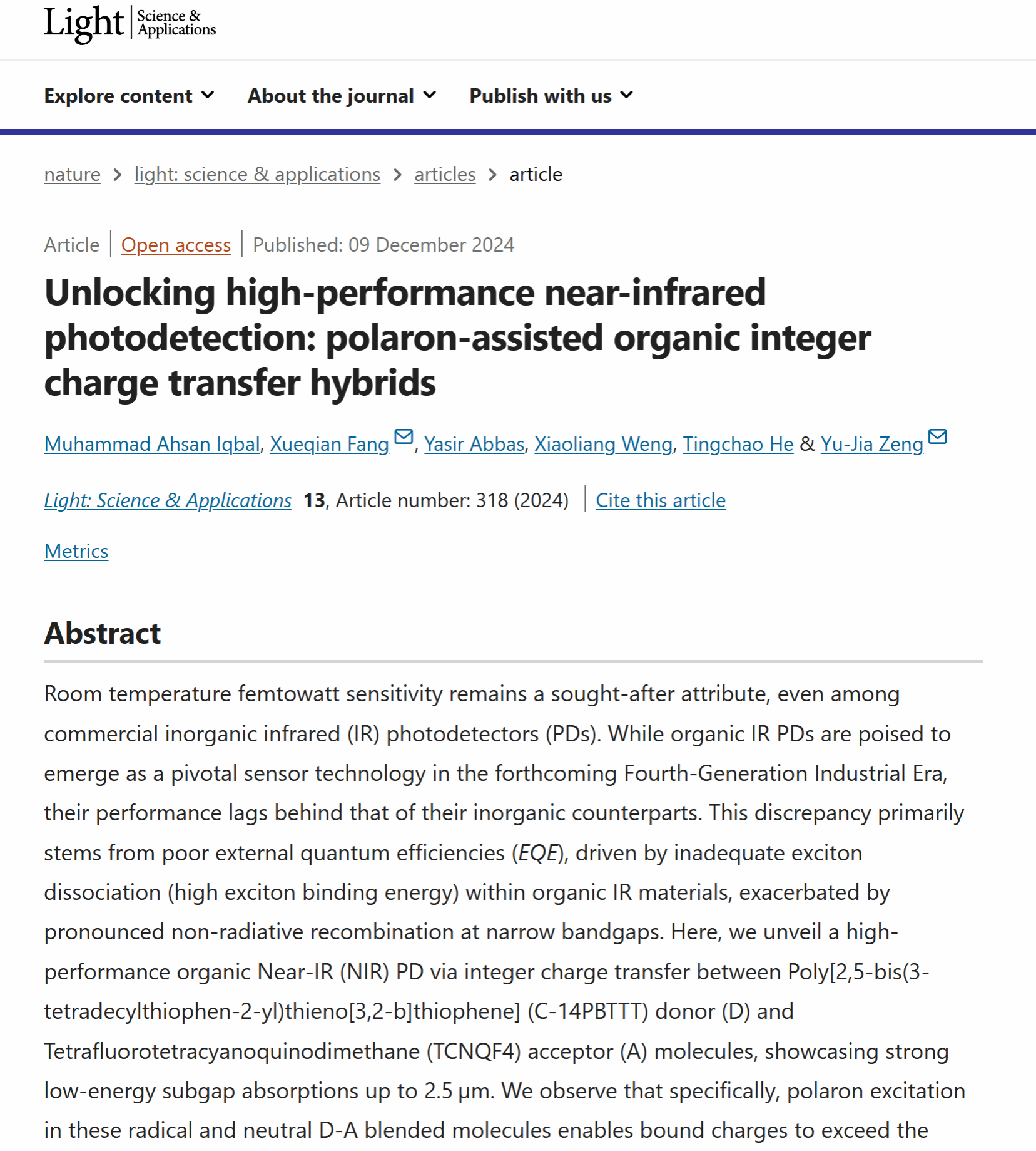 近日,Nature旗下期刊、国际光学顶级期刊《Light: Science &Applications》刊发我校房学谦教授课题组在近红外光探测领域的最新成果,论文题目为“Unlocking High-Performance Near-Infrared Photodetection: Polaron-Assisted Organic Integer Charge Transfer Hybrids (解密高性能近红外光探测:极化子辅助的有机整数电荷转移混合法)”,Muhammad Ahsan Iqbal博士后为论文第一作者,房学谦教授和深圳大学曾昱嘉教授为通讯作者,我校为论文第一完成单位。