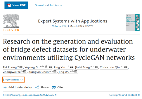 近日,我校机械工程学院尹玲教授课题组在计算机科学领域TOP期刊《Expert Systems with Applications》发表了题为Research on the generation and evaluation of bridge defect datasets for underwater environments utilizing CycleGAN networks的研究论文。我校张斐博士为论文的第一作者,硕士研究生谷叶阳为通讯作者,45612藏宝阁资料为论文第一完成单位。广东省城市生命线工程智慧防灾与应急技术重点实验室、45612藏宝阁资料中法学院共同发表。