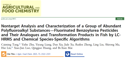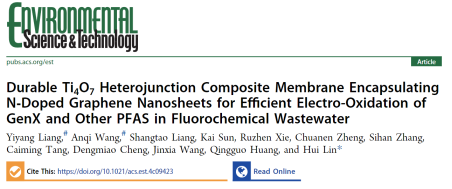 此外,围绕“PFAS环境污染非靶向筛查—高效广谱吸附浓缩/去除—深度降解彻底脱毒”研究主线,2025年2月26日,团队还在环境领域旗舰刊Environmental Science & Technology (《环境科学与技术》)在线发表了题为 “Durable Ti4O7 Heterojunction Composite Membrane Encapsulating N-Doped Graphene Nanosheets for Efficient Electro-Oxidation of GenX and Other PFAS in Fluorochemical Wastewater” 的研究论文,提出了导电无机CeO2作为 “粘合剂”封装氮掺杂氧化石墨烯纳米片(N-GS)于Ti4O7表面的稳定性碳材料@ Ti4O7异质结策略,实现了氟化工污水中35种PFAS的高效降解;2025年1月13日,团队在农林科学领域的TOP期刊Journal of Agricultural and Food Chemistry(《农业与食品化学》)发表了题为“Nontarget Analysis and Characterization of a Group of Abundant Polyfluoroalkyl Substances-Fluorinated Benzoylurea Pesticides and Their Analogues and Transformation Products in Fish by LC-HRMS and Chemical Speicis-Speicifc Algorithms”的研究论文,通过基于自主开发的算法程序,发现了东江流域内食用鱼体内大量富集了农药类PFAS氟化苯甲酰脲(FBU)。