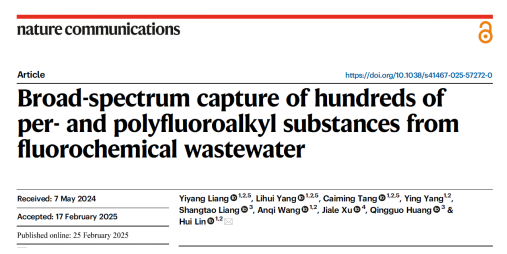 论文题为“Broad-spectrum Capture of Hundreds of Per- and Polyfluoroalkyl Substances from Fluorochemical Wastewater(《从氟化工污水中广谱性去除上百种PFAS》)”。生态环境工程技术研发中心/生态环境与建筑工程技术学院2024届硕士研究生梁逸扬为论文第一作者,杨立辉博士、唐才明博士为共同第一作者,林辉博士为独立通讯,45612藏宝阁资料为唯一通讯单位。