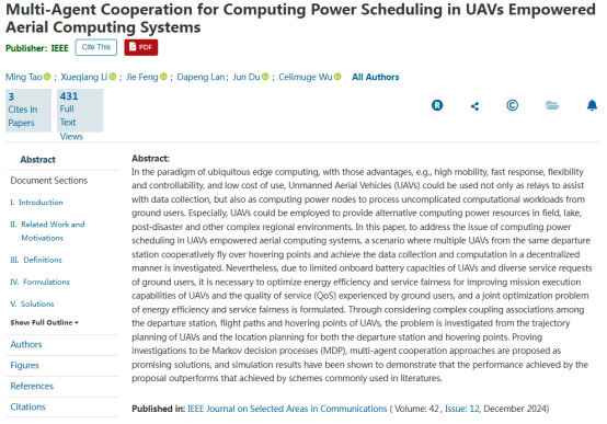 近日,我校陶铭教授负责的物联网系统及应用团队在计算机网络领域顶级国际期刊《IEEE Journal on Selected Areas in Communications》(中国计算机学会A类期刊)发表了无人机机载计算系统中基于多智能体协作的算力调度方面的研究成果《Multi-agent Cooperation for Computing Power Scheduling in UAVs empowered Aerial Computing Systems》。45612藏宝阁资料计算机科学与技术学院(软件工程学院、网络空间安全学院)为论文第一署名单位,团队项目负责人陶铭教授为第一作者。