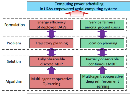 在泛在边缘计算范式中,由于具有高移动性、快速响应、灵活性和可控性以及使用成本低等优势,无人机(UAV)不仅可以作为中继协助数据收集,还可以作为计算节点处理来自地面用户的简单计算任务。特别是,无人机可用于在野外、湖泊、灾后和其他复杂区域环境中提供替代计算资源。本文研究了无人机赋能的空中计算系统算力调度问题。由于无人机的机载电池容量有限以及地面用户的服务请求多样,有必要优化能源效率和服务公平性,以提高无人机的任务执行能力和地面用户所体验的服务质量(QoS),为此,提出了能源效率和服务公平性的联合优化问题。通过考虑无人机出发站、飞行路径和悬停点之间的复杂耦合关联,从无人机的轨迹规划以及出发站和悬停点的位置规划两方面对该问题进行了研究。通过证明该研究问题属于马尔可夫决策过程(MDP)问题,提出了基于多智能体协作的解决方案。相关成果可应用于应急救援、无人机携能无线充电等场景。