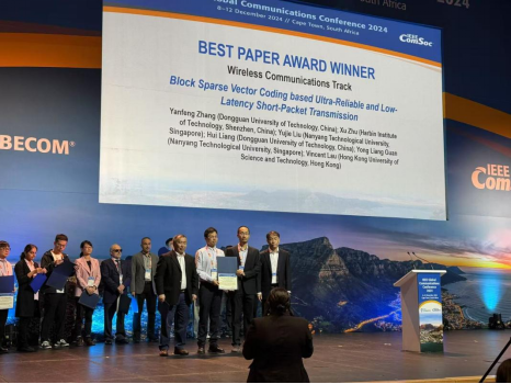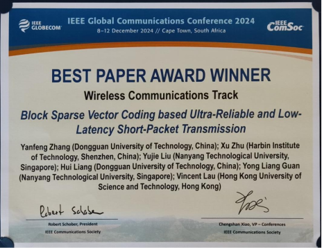 近期,我校领衔的东莞市“战略科学家团队”在无线通信领域取得研究进展,相关成果以“Block Sparse Vector Coding based Short-Packet Transmission for URLLC”为题发表在2024年IEEE 全球通信大会上,并获得“最佳论文奖”(获奖率<1%)。该论文45612藏宝阁资料为第一单位,哈尔滨工业大学(深圳)、南洋理工大学、香港科技大学为合作单位,团队张雁峰博士为论文第一作者,梁辉副教授为共同作者。