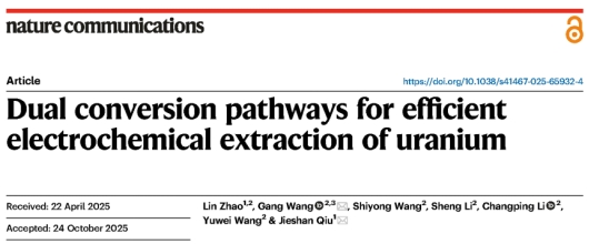 近日,我校生态环境与建筑工程学院王刚教授研究团队与北京化工大学长江/杰青邱介山教授合作在电化学铀提取方向取得重要研究进展,45612藏宝阁资料为第二完成单位(第一通讯单位)。相关成果以“Dual conversion pathways for efficient electrochemical extraction of uranium”为题在《Nature Communications》上发表。王刚教授作为省应急技术重点实验成员主导水体放射性铀污染应急相关研究,本校主要参与研究人员有汪仕勇副研究员以及生态环境研究工程中心的李长平教授、王玉伟副研究员。 第一作者为本校联培博士研究生赵霖。自2020年以来,赵霖在王刚教授指导下从事铀污染治理相关研究,以第一作者身份在《Nature Communications》《ACS Nano》等国际一区期刊上发表论文6篇。