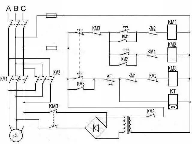 采用交流电磁铁制动的三相异步电动机有时会因制动电磁铁延时释放,造成制动失灵。造成电磁铁延时释放的原因是接触器的主回路电源虽被切断,但电动机由于剩磁存在,定子绕组产生感应电动势加在交流电磁铁上,使电磁铁不会立即释放。解决方法很简单,只要在交流电磁铁线圈上串入一个交流接触器常开触点,使得断开电动机电源的同时断开电磁铁与电动机绕组线圈,即可使电磁铁立即释放。