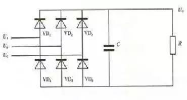 在一个周期中,每个二极管只有三分这一的时候导通(导通角为120度)。负载两端的电压为线电压。