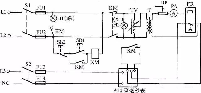 热继电器校验台如图20所示,它主要由调压器TV、降压变压器T、电位器RP、410型毫秒表等元件组成。