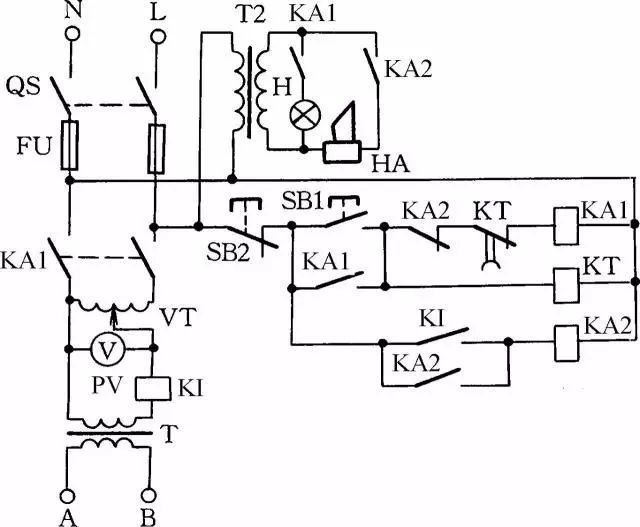 工作原理:闭合S后,按下按钮SB1,变压器得电输出36V低电压,使得继电器或交流接触器KA吸合。放松按钮SB1后,KA自锁触点使KA保持吸合,继续给变压器接通电源。https://www.dgdqw.com/wk/44590-1.html如果变压器次级发生短路故障,继电器线圈电压为零,此时KA便失电释放,将变压器电源断开,保护变压器不被破坏。