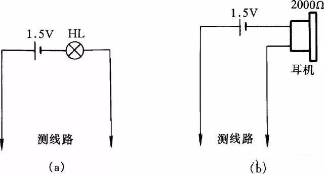 图(a)、(b)是最简便的线路通断检测器。当测得导线通路时,灯泡会发光,耳机在通断瞬时会发响;当线路断路时,耳机不响,灯泡不亮。这种方法简单易行,非常适合初学电工制作工具仪表或代替万用表做测量,其优点是携带方便。