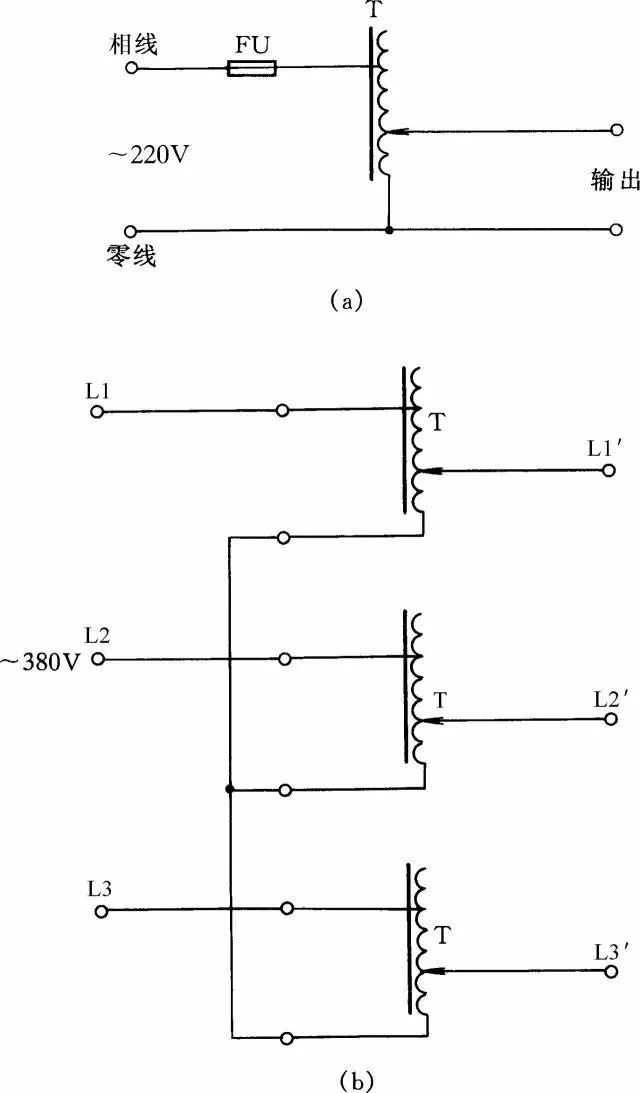 三相自耦调压器的接线线路如图(b)所示,这种接触式自耦调压器为可调型,它可作为带负载无级平滑调节电压用的用电设备。三相自耦调压器是将3个单相自耦调压器叠装而成的,电刷同轴转动,按Y形接法连接。