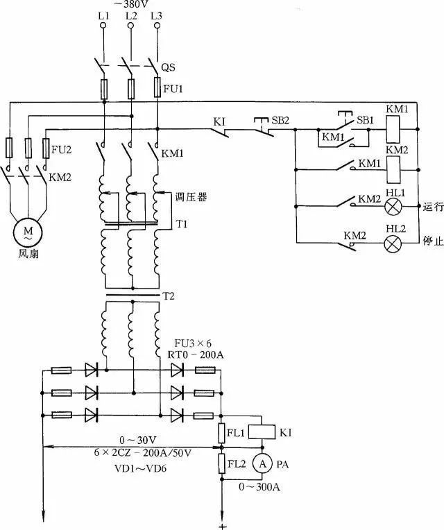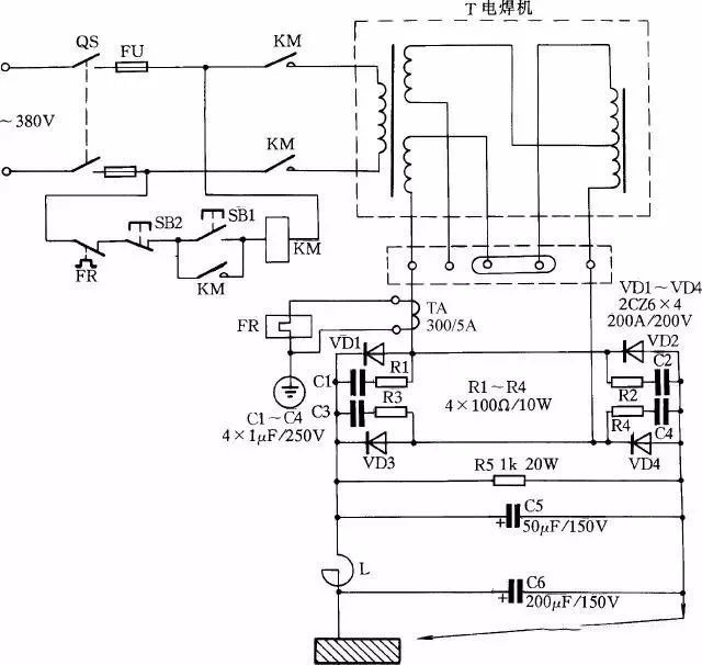 电路中VD1 ~ VD4 为4 只硅整流二极管;R1 ~ R4、C1 ~ C4组成硅整流器件的过压保护电路;FR 为过流继电器,保护硅整流器件。当负载电流超过额定值时,电流互感器次级电流相应增加,带动继电器FR 动作,FR 常闭触点打开,接触器KM 释放,触点打开切断电焊机电源。硅整流器件用0. 25kW 风扇作风冷设备。图中,C5 为滤波电容,R5 为泄放电阻。
