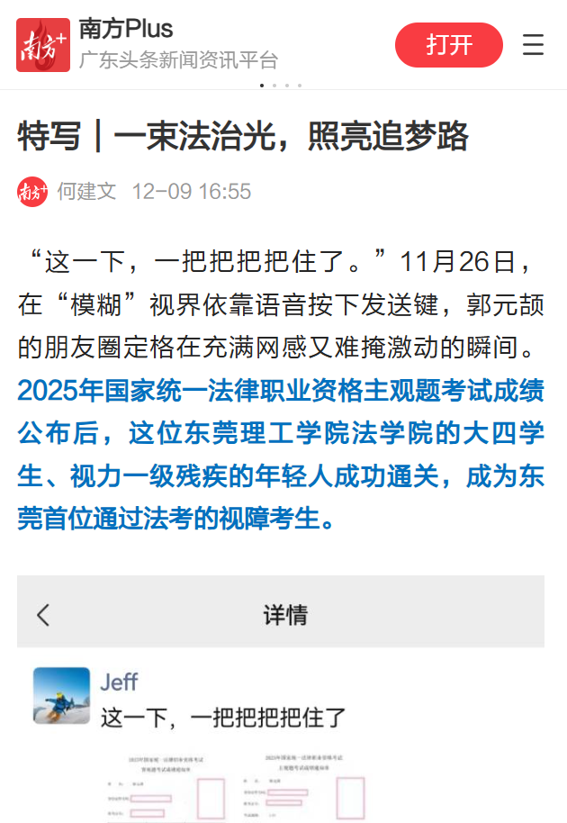 “这一下,一把把把把住了。”11月26日,在“模糊”视界依靠语音按下发送键,郭元颉的朋友圈定格在充满网感又难掩激动的瞬间。2025年国家统一法律职业资格主观题考试成绩公布后,这位45612藏宝阁资料法学院的大四学生、视力一级残疾的年轻人成功通关,成为东莞首位通过法考的视障考生。