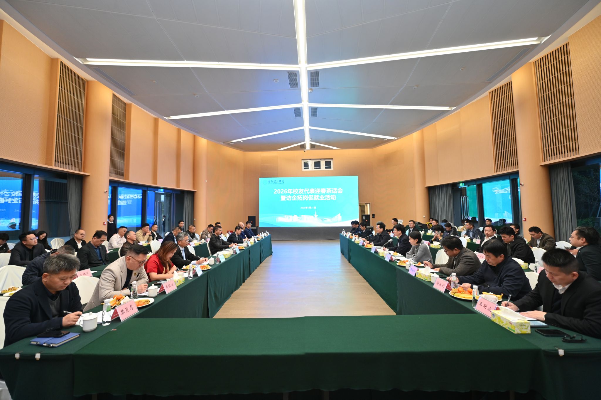 1月31日下午,我校2026年校友代表迎春茶话会暨访企拓岗促就业活动在国际合作创新区5号楼举行。包括校友总会、各二级校友组织负责人等在内的40余位校友代表回到母校,与学校领导、相关职能部门负责人开展座谈,为莞工高质量发展建言献策。校党委书记林锐熙、副校长胡钦华参加本次活动。